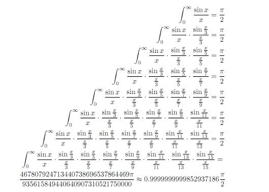다시 원래 문제로 돌아가서… 이 적분들은 David Borwein과 Jonathan Borwein(부자라고 한다)의 이름을 딴 Borwein integral로 알려져 있다. 마치 항상 \frac{\pi}{2}로 나올 것만 같았는데 정말 뜬금없는 결과가 이어지는데, 이 적분에 대해서는 재미있는 일화가 있다.