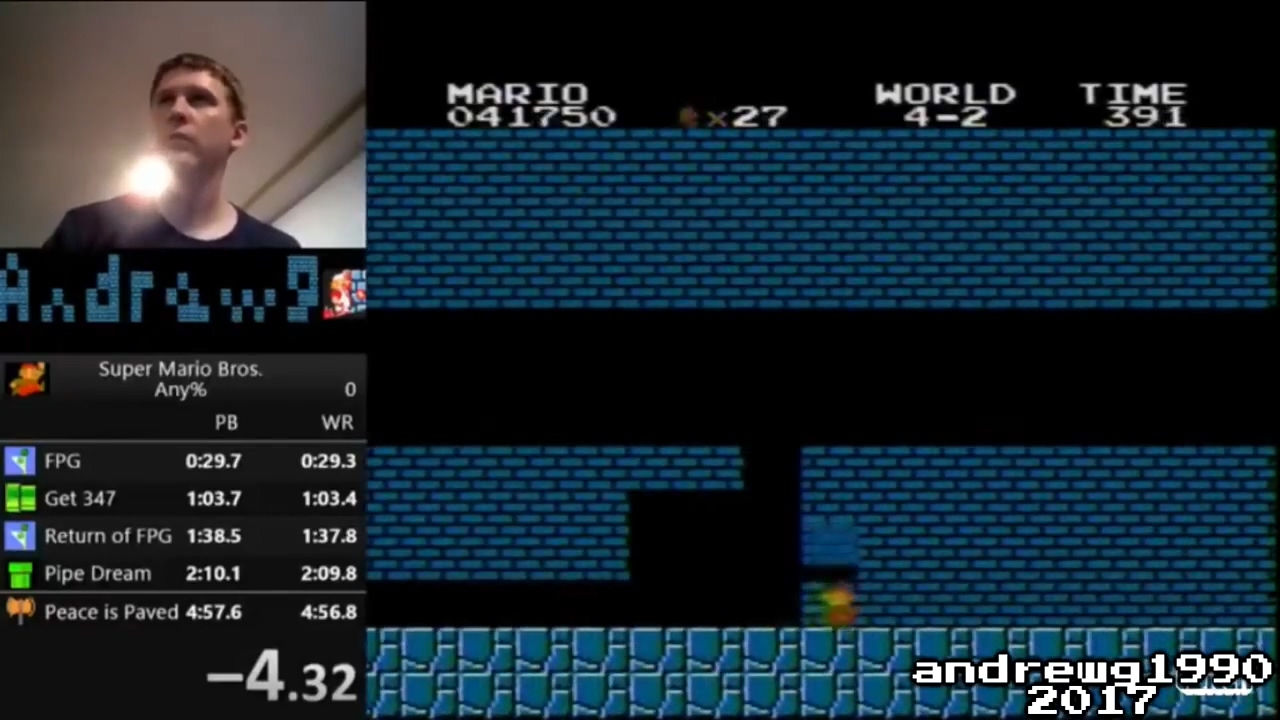 초기엔 화면을 고정시키고 마리오를 왼쪽으로 움직여 오른쪽 끝으로 이동시키는 버그를 이용하는 것이 언급됐으나, 2007년 AndrewG가 벽면에 부딪히며 점프할 때 뒤쪽을 바라보게 하면 x좌표가 어긋나는 것을 이용해 시간을 더 단축시키는 것에 성공함.