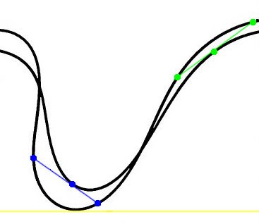 1번 때문에 뒷바퀴 경로의 접선을 그으면 반드시 앞바퀴 경로와 만나야 한다. 따라서 아래 그림처럼 “더 구불구불한” 경로의 노란 접선은 나머지 경로와 만나지 않으므로, 이 경로는 앞바퀴의 것이 된다.