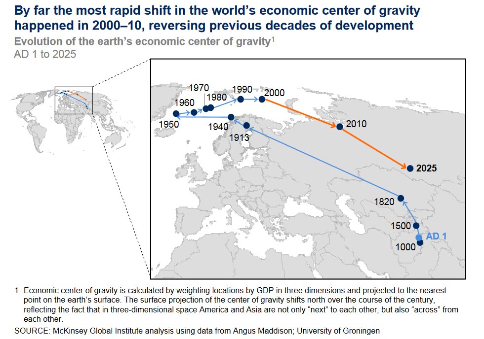 2012년 맥킨지의 보고서 “Urban world: Cities and the rise of the consuming class”에 등장한 세계 경제 무게중심의 이동. 중국의 급성장으로 인한 2000년~2010년의 변화가 가장 빠름. 지표면 상에서의 가중치 무게중심을 어떻게 구하나 했는데 각국의 지리적 중심에 GDP 가중치를 둬서 그냥 3차원 상에서 무게중심을 구한 후 그와 가장 가까운 지표면의 지점을 구하는 식으로 산출했다고…