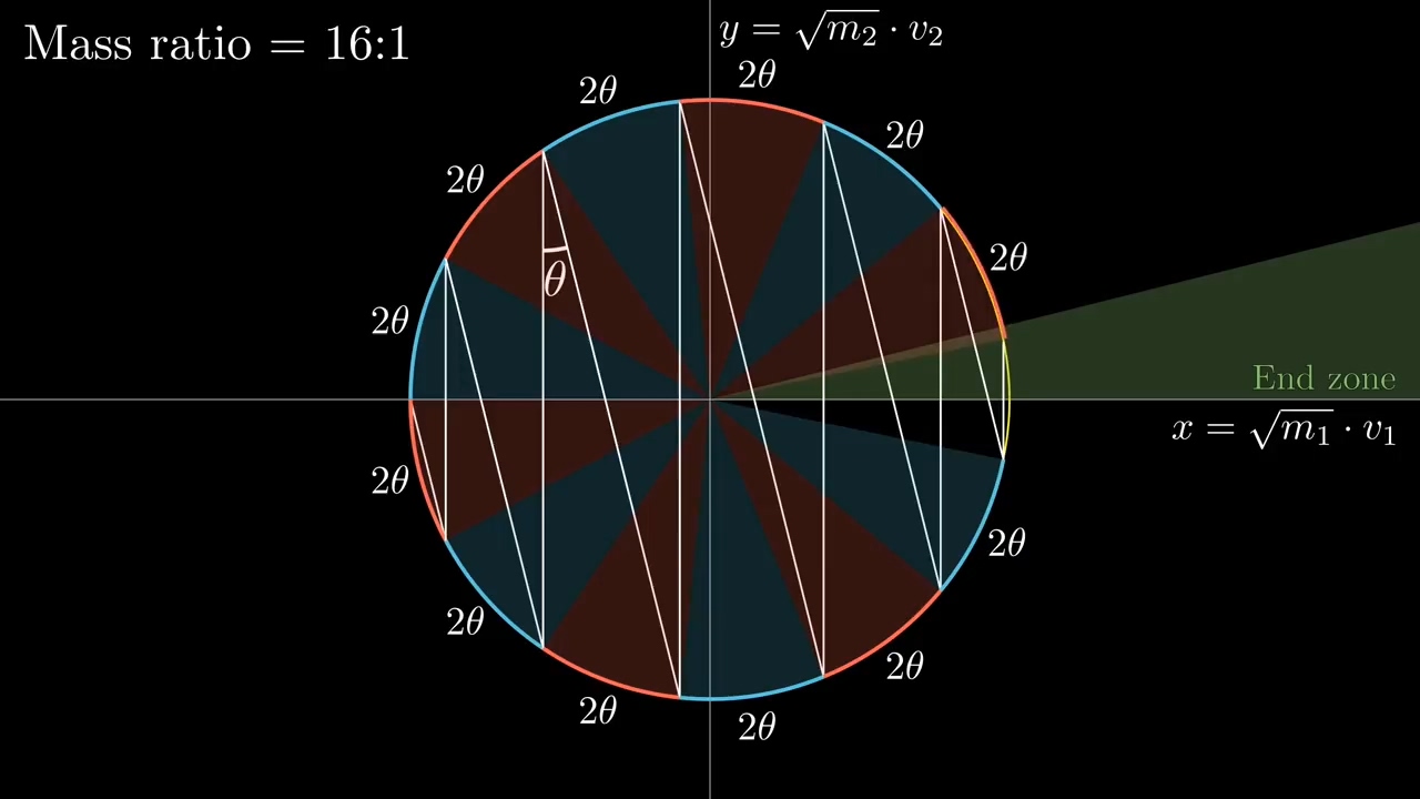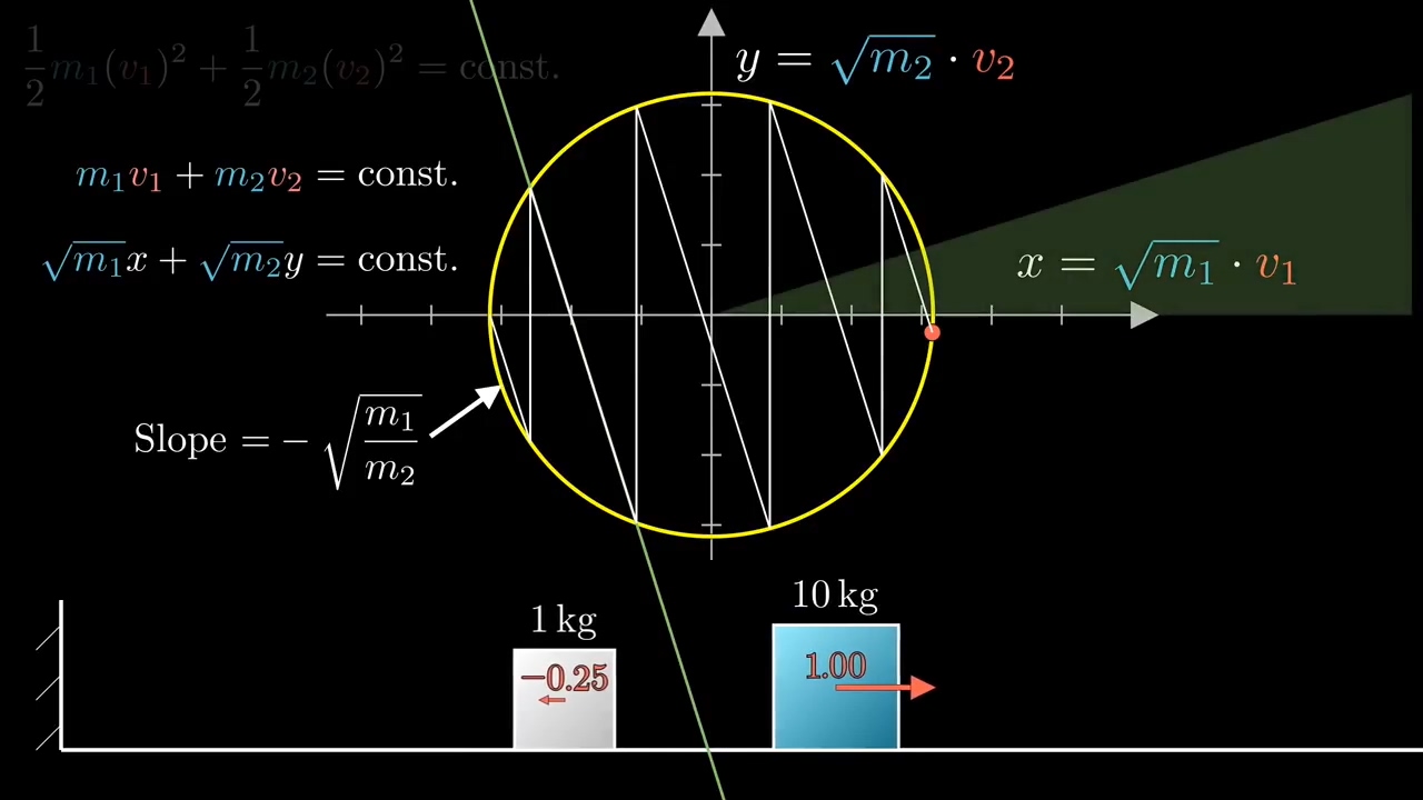 그러면 에너지가 일정하단 점에서, 현재 상태에 해당하는 점은 반드시 주어진 원주 위에 놓여야 하고, 두 물체가 부딪히면 모멘텀이 일정해 기울기가 인 직선 위를 움직여야 하고 물체와 벽이 부딪히면