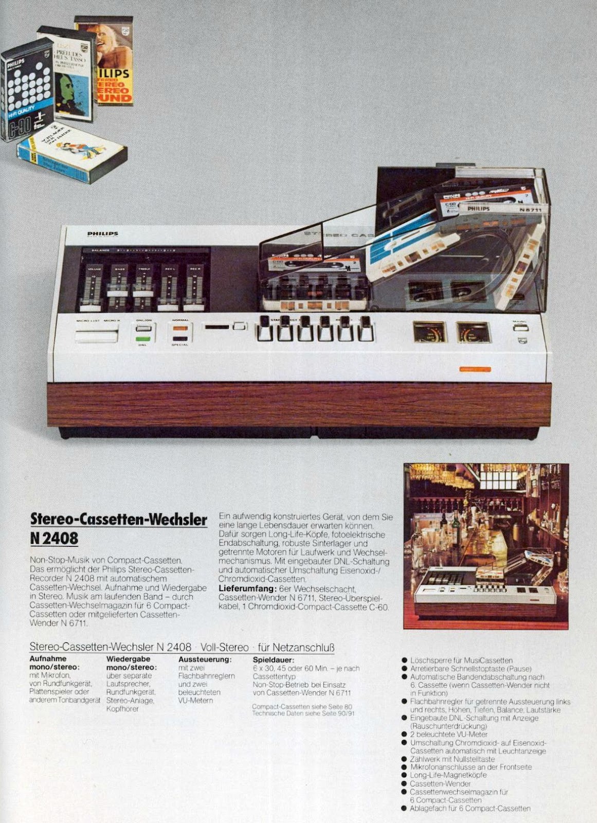 1976년 필립스에서 만든 N 2408. (사진은 1979년 독일 카탈로그로 N 6711 타입이라고) 카세트 테이프의 반대면을 넣는다는 목적을 이루기 위해 꺼내고 올리고 돌리는 작업을 기계화하려고 한 것.