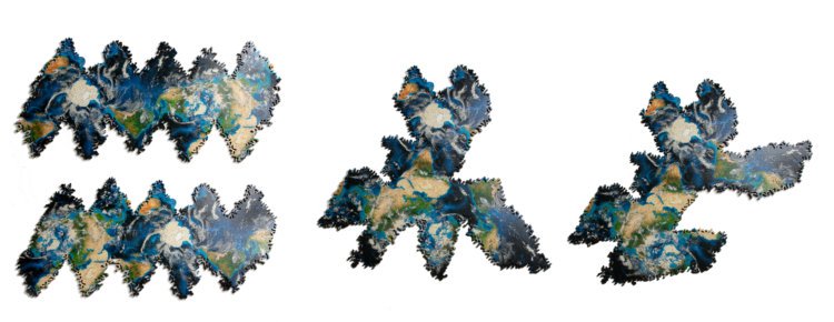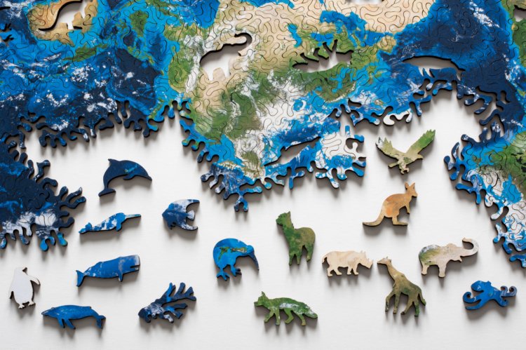 Nervous System의 Earth Puzzle. 지구를 정이십면체에 사영시킨 Dymaxion 매핑을 응용하여 바깥 경계선 없이 만든 세계지도 직소 퍼즐로, 한쪽 경계에 있는 피스가 다른 쪽에도 끼워질 수 있어 여러가지 방법으로 완성할 수 있게 만들었다고 한다. 각 지역에 해당되는 16개의 동물 피스도 동봉. (키위새, 알파카 등등) 442 피스, 120달러.