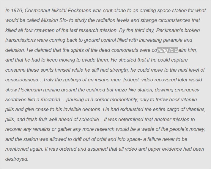 “The Madness of Mission 6”. 그림 하나만으로 팩맨에 대한 또 다른 어두운 해석을 보여주는 점이 인상적이다. 위 그림을 도안으로 만든 티셔츠가 판매될 당시 아래와 같은 2차 창작 크리피파스타의 풀스토리가 첨부되어 있었다고. 1976년 지난 연구 미션에서 4명의 멤버가 죽은 이유를 조사하시 위해 우주 정거장에 홀로 남겨진 니콜라이 펙만(Nikolai Peckmann)이 편집증에 시달려 4명의 유령이 그를 죽이려 쫓아오고 그들을 피해야 한다는 환각을 보게 되었단 내용.
