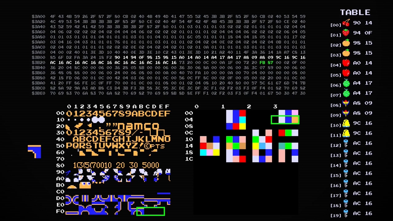 아이콘 테이블은 $3B08에 2바이트씩 저장되어 있고, 앞의 1바이트는 그래픽(4개단위로 뭉침), 뒤의 1바이트는 팔레트를 뜻함.