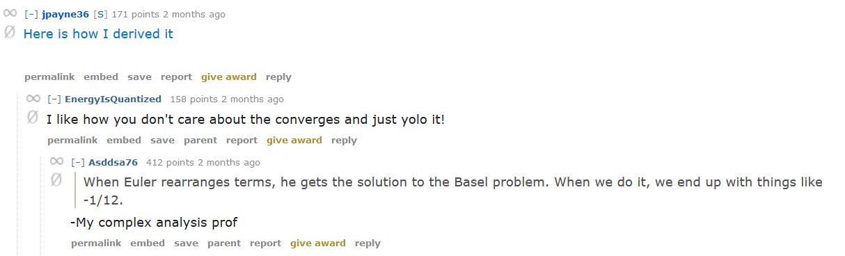 “‘오일러는 항을 재배치해서 바젤 문제를 풀었고 우리가 그런 짓을 하면 -1/12같은 결과를 얻는다.’ – 복소해석 교수님”