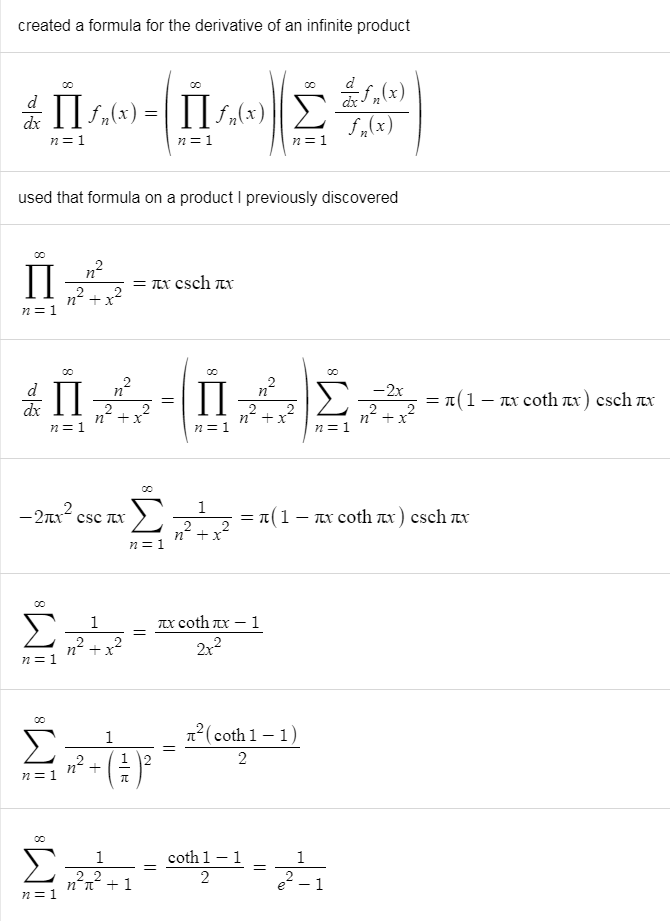 보다시피 무한한 항의 곱을 미분하면서 수렴 조건을 따지지 않고 공식을 그냥 써버려서 엄밀하지 못한 풀이임. 이 리플 밑으로 달린 리플들: