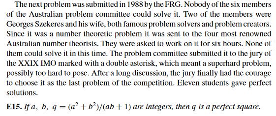 Arthur Engel은 자신의 저서 “Problem Solving Strategy”에서 이 문제에 얽힌 일화를 소개했다. 당시 IMO 문제 출제위원회에 있던 6명의 수학자들은 이 문제를 풀지 못했고, 이 문제를 호주의 정수론학자 네 명에게 보내 6시간 안에 풀게 했으나 아무도 풀지 못했다. 그럼에도 이들은 이 문제를 후보 문제에 올렸고, (엄청 어렵단 뜻으로 ** (double asterisk) 표시를 붙였다고 한다) jury meeting(단장 회의)을 통해 이 문제가 IMO 문제로 출제된다. 그리고 11명의 고등학생들이 이 문제를 풀었다.