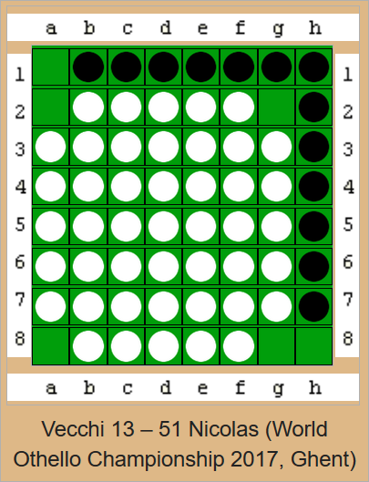 위키피디아 Reversi 항목에서는 공식 대회에서 실제로 있었던 final configuration들 중 보드를 전부 채우지 않고 끝난 예시들이 몇 나온다.
