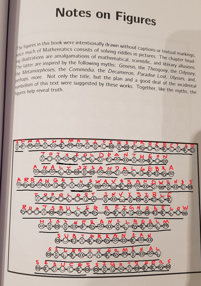 두 번째 그림의 경우, 일단 흰 마디와 검은 마디에서 흰 마디를 띄어쓰기로 보았을 때 영어 문장이 아닐까 싶었다. (다만 2~3글자 전치사/관사/정관사가 별로 없고 단어들이 길어서 좀 긴가민가하긴 했는데 위 글에서 신화적 표현을 썼으리란 암시가 있어서 일단 가능성을 열어둠) 그래서 먼저 치환 암호일 것으로 상정하기로. 하던대로 일단 THE에 해당할만한 것을 찾고 E에 해당하는 것이 적절히 많이 등장하는지를 체크했는데 그에 해당하는게 하나 보였다. (아래 그림에서 밑줄친 부분) 이를 토대로 일단 T H E를 찾고, 두 번째 줄에 T_ THE가 있으니 O로 추정하고, 다섯 번째줄에 TO_O_O__가 있으니 TOPOLOGY로 추정하는 식으로 진행했다. 그 과정에서 각 알파벳에 해당하는 그림들이 단순히 임의로 주어진 심볼이 아니라, 그 알파벳을 구성하는 획들의 관계를 표현하는 것임도 어렴풋이 파악할 수 있게 되었다. 각 획이 하나의 원으로 표현되는 식. 다만 아직도 universal + explicit하게 설명할 수 있는 규칙은 잘 모르겠다. inversion한 그림하고도 비슷한데 정확하게 들어맞지는 않음.