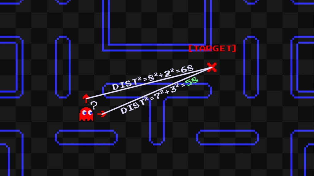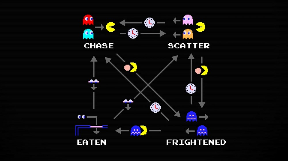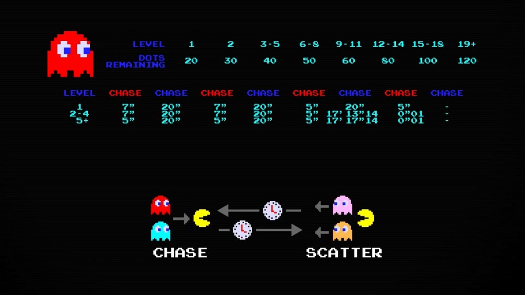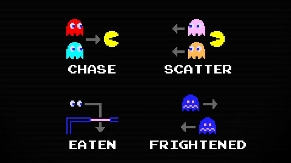 결론부터 이야기하자면, 팩맨에서 유령들의 움직임은 (일부 예외를 제외하면) 결정론적이다. 즉 그들의 움직임에는 랜덤 요소가 없고, 각자의 개성과 경과 시간, 팩맨의 위치 등에 따라 무조건 어디로 움직일지가 결정된다. 위 영상에서 그 움직임의 조건이 구체적으로 낱낱이 파헤쳐진다.