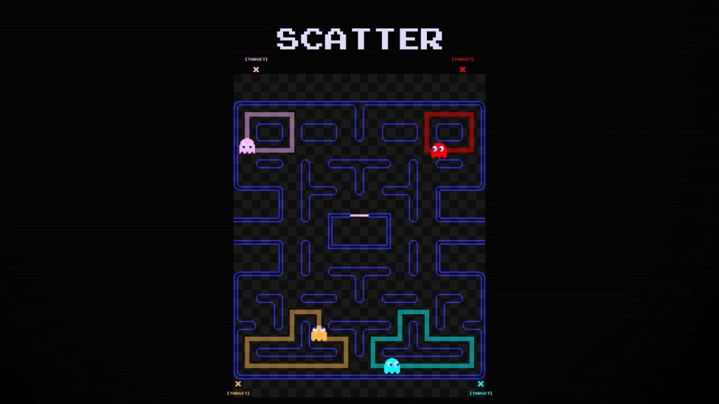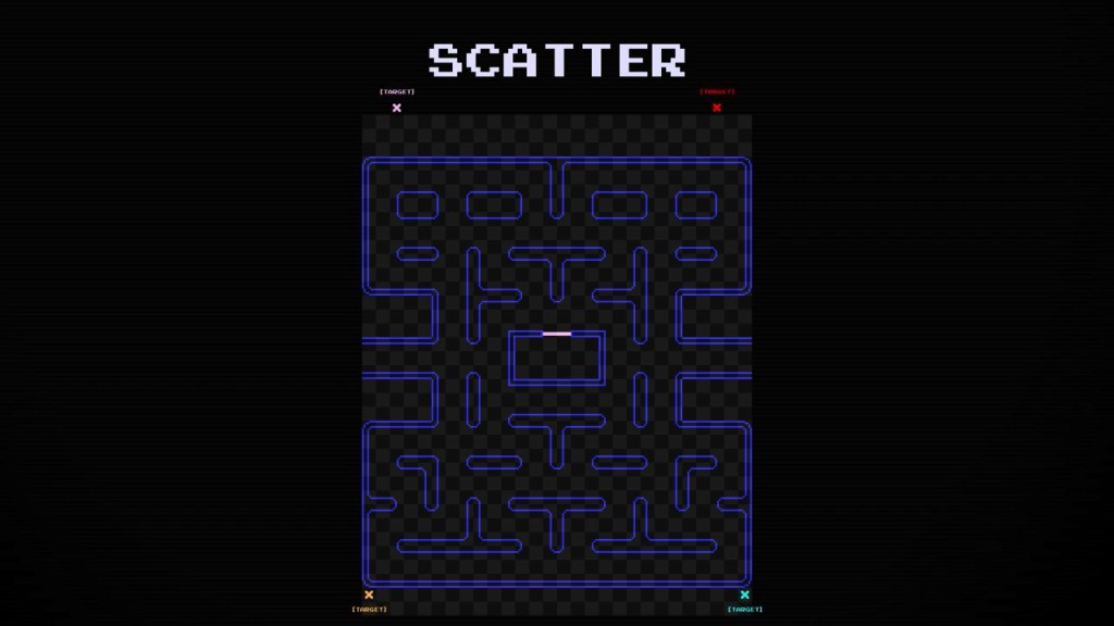 이제 가장 중요한 추격 모드. 여기에서 네 유령들의 서로 다른 전략에 따라 목표 지점이 달라지고, 각 유령의 개성이 나타나게 된다.