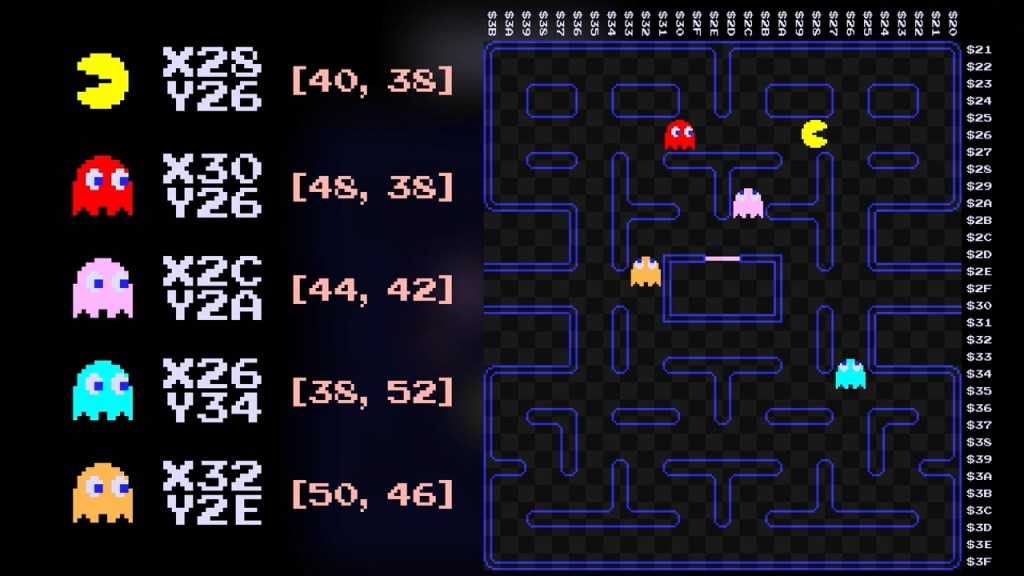 그런데 위로 4칸 움직일 때의 변위 벡터를 구할 때, 00 FF에서 4를 곱하는 과정에서 03 FC처럼 받아올림 3이 버려지지 않고 x 좌표에 영향을 주게 되어버린 것. 앞서 잉키의 목표 지점을 설명할 때 팩맨의 두 칸 앞을 표시해야 하는데 왼쪽으로 치우쳐져 있던 경우도 이와 같은 이유로 나타난 버그이다.