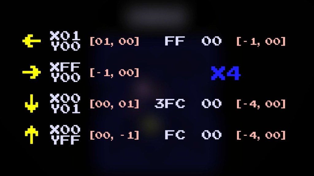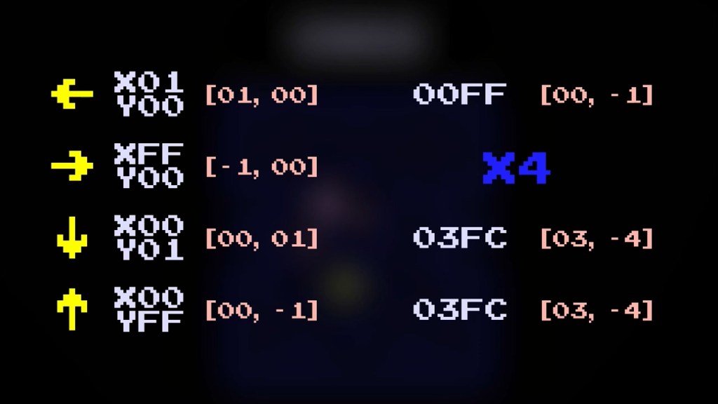 여기서 각각의 좌표는 8비트 unsigned int로 00(=0)에서 FF(=255)까지의 16진수로 표현되며, 1을 빼는 것은 그 보수인 FF를 더하는 것으로 생각한다. (이는 가장 큰 자리에서의 받아올림을 무시하기 때문에 가능하다.) 더 나아가서, 4칸만큼 움직인 곳의 좌표를 구하기 위해서 이 방향벡터들에 4를 곱하여 변위 벡터를 구한 후 이걸 위치 벡터에 더한다. 예컨대 주어진 위치에서 오른쪽으로 네 칸 나아간 곳을 나타내기 위해서는 오른쪽을 표현하는 벡터 FF 00에 4를 곱한 3FC 00을 더해야 한다. 여기서 가장 큰 자리에서의 받아올림에 해당하는 3은 무시되어 FC 00을 더하는 것이 되며 이는 제대로 작동한다.