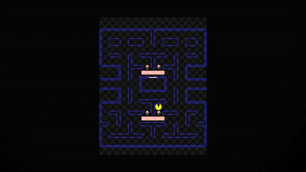 참고로, 아래 그림에서 표시된 위치에서는 유령이 중간에 방향을 바꾸는 것이 불가능하게 추가적으로 설정되어 있다. 즉 유령이 저 구역에 들어서면 위로 방향을 전환하는 것이 불가능하므로, 팩맨이 아래 그림과 같은 위치에 있으면 유령에게 장시간 잡히지 않을 가능성이 높다.