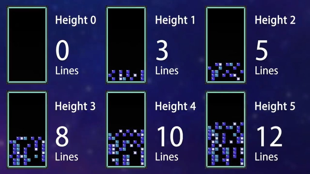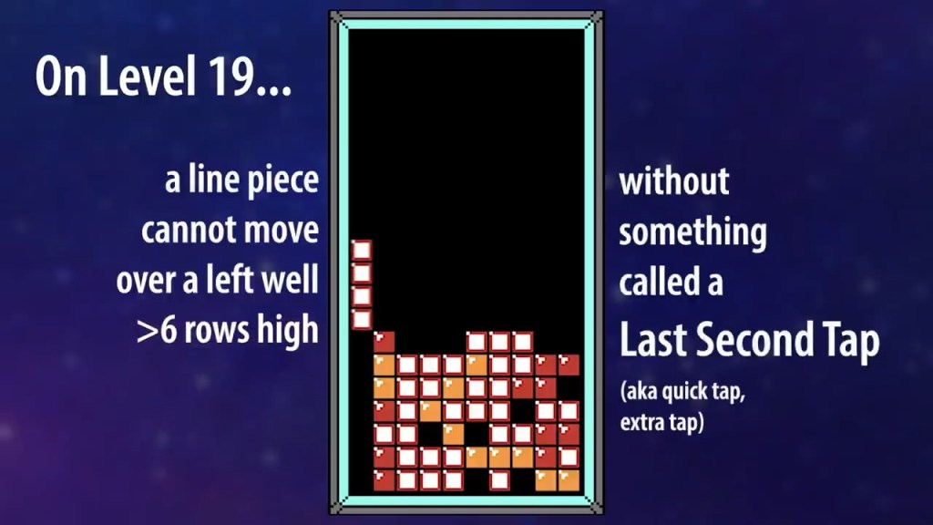 NES 테트리스에는 두 가지 모드가 있다. A 타입 모드는 플레이하다보면 속도가 올라 게임오버되기 전까지 스코어링을 겨루는 모드로 클래식 테트리스 월드 챔피언십에도 쓰이고 있다. B 타입 모드는 레벨과 높이를 지정하면 필드 위에 특정 높이까지 랜덤한 블록들이 일부 주어져있는 채로 25줄을 깨면 클리어하는 일종의 퍼즐 모드이다. 고를 수 있는 레벨은 0에서 19까지인데, 레벨 13-15는 내려오는 속도가 1줄/4프레임, 레벨 16-18은 1줄/3프레임, 레벨 19는 1줄/2프레임이다. (예전 글인 테트리스 월드 챔피언십의 관전 포인트 참조. 이후 등장할 DAS나 DAS charging 같은 개념도 이 글에서 설명되어 있으니 익숙하지 않은 경우 해당 글이나 해당 글 내에 임베드된 출처 영상을 참조하는 편이 좋을 듯) 높이는 0에서 5까지 선택 가능하고, 5를 선택하면 12줄에 걸친 블록들이 놓여진 상태에서 게임이 시작된다. 즉 19-5, 레벨 19 높이 5는 B 타입 모드의 가장 어려운 스테이지인 셈이다.